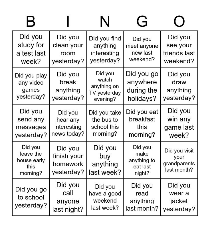 This bingo card has a free space and 24 words: Did you finish your homework yesterday?, Did you call anyone last night?, Did you watch anything on TV yesterday evening?, Did you go to school yesterday?, Did you see your friends last weekend?, Did you study for a test last week?, Did you play any video games yesterday?, Did you clean your room yesterday?, Did you eat breakfast this morning?, Did you buy anything last week?, Did you go anywhere during the holidays?, Did you send any messages yesterday?, Did you make anything to eat last night?, Did you visit your grandparents last month?, Did you break anything yesterday?, Did you read anything last month?, Did you win any game last week?, Did you find anything interesting yesterday?, Did you draw anything yesterday?, Did you hear any interesting news today?, Did you wear a jacket yesterday?, Did you leave the house early this morning?, Did you meet anyone new last weekend? and Did you have a good weekend last week?.