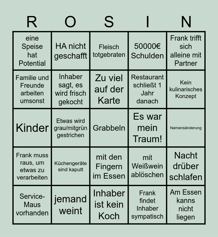 This bingo card has 25 words: Küchengeräte sind kaputt, Inhaber ist kein Koch, Zu viel auf der Karte, Service-Maus vorhanden, Frank trifft sich alleine mit Partner, eine Speise hat Potential, Familie und Freunde arbeiten umsonst, HA nicht geschafft, Es war mein Traum!, mit den Fingern im Essen, Restaurant schließt 1 Jahr danach, Kinder, mit Weißwein ablöschen, Nacht drüber schlafen, Inhaber sagt, es wird frisch gekocht, Am Essen kanns nicht liegen, Namensänderung, Fleisch totgebraten, Kein kulinarisches Konzept, Etwas wird grau/mitgrün gestrichen, Grabbeln, jemand weint, Frank muss raus, um etwas zu verarbeiten, 50000€ Schulden and Frank findet Inhaber sympatisch.