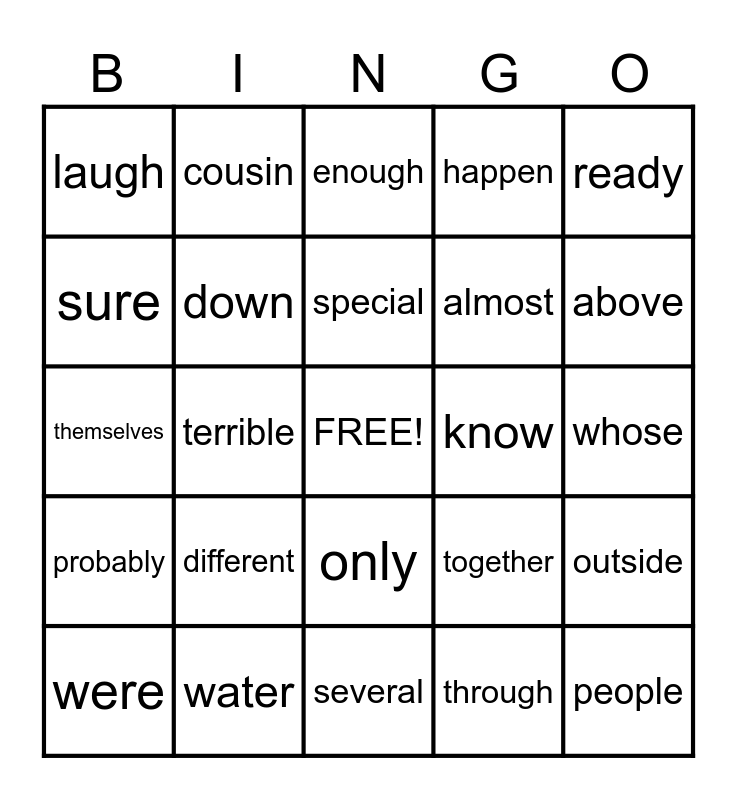 This bingo card has a free space and 24 words: were, different, special, through, ready, laugh, cousin, enough, know, whose, themselves, down, together, outside, sure, water, several, happen, above, probably, terrible, only, almost and people.