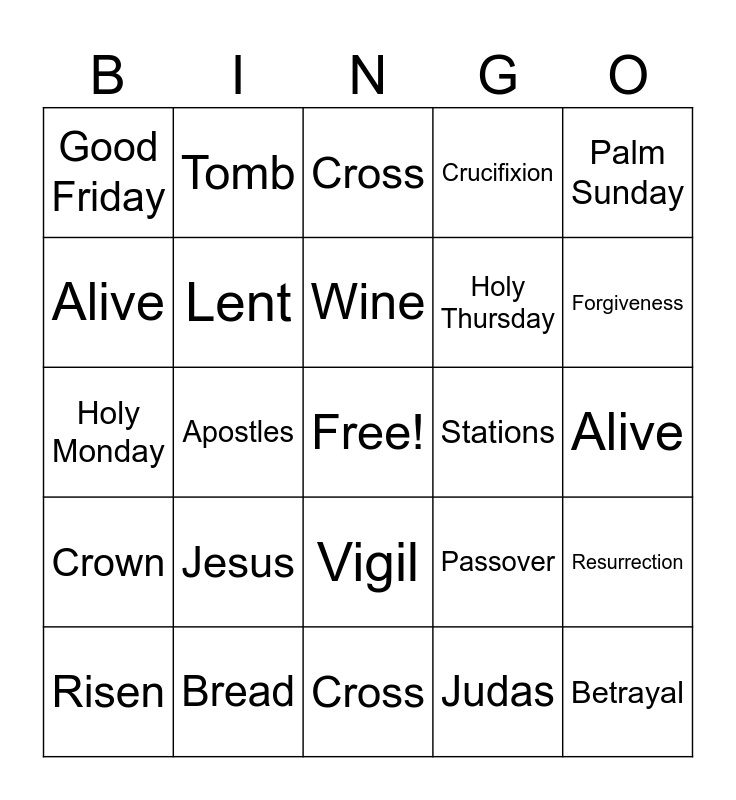 This bingo card has a free space and 24 words: Jesus, Bread, Wine, Risen, Palm Sunday, Good Friday, Alive, Tomb, Stations, Vigil, Holy Thursday, Holy Monday, Passover, Resurrection, Lent, Judas, Alive, Cross, Forgiveness, Apostles, Betrayal, Crown, Crucifixion and Cross.