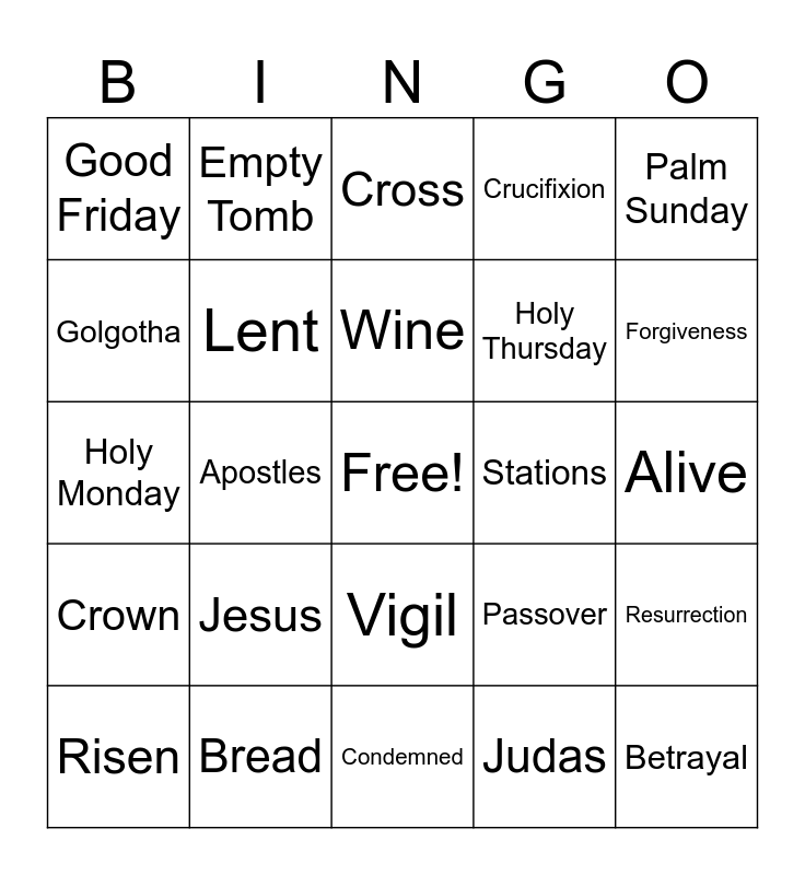 This bingo card has a free space and 24 words: Jesus, Bread, Wine, Risen, Palm Sunday, Good Friday, Golgotha, Empty Tomb, Stations, Vigil, Holy Thursday, Holy Monday, Passover, Resurrection, Lent, Judas, Alive, Cross, Forgiveness, Apostles, Betrayal, Crown, Crucifixion and Condemned.