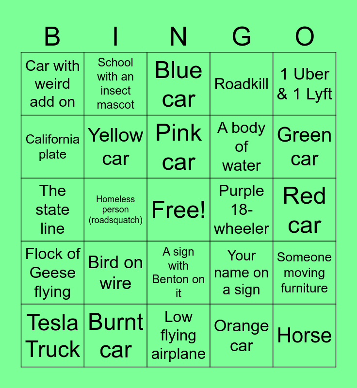 This bingo card has a free space and 24 words: Bird on wire, Burnt car, Pink car, Tesla Truck, 1 Uber & 1 Lyft, Car with weird add on, California plate, School with an insect mascot, Purple 18-wheeler, A sign with Benton on it, A body of water, The state line, Your name on a sign, Someone moving furniture, Yellow car, Orange car, Red car, Blue car, Green car, Homeless person (roadsquatch), Horse, Flock of Geese flying, Roadkill and Low flying airplane.