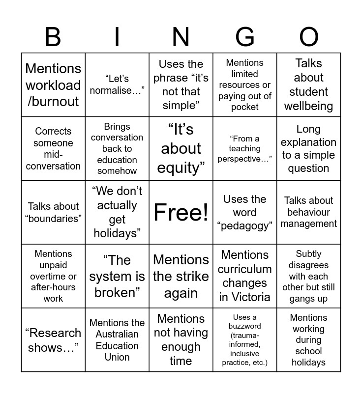 This bingo card has a free space and 24 words: “The system is broken”, Mentions the Australian Education Union, “It’s about equity”, “Research shows…”, Talks about student wellbeing, Mentions workload /burnout, Corrects someone mid-conversation, “Let’s normalise…”, Uses the word “pedagogy”, Mentions the strike again, “From a teaching perspective…”, Talks about “boundaries”, Mentions curriculum changes in Victoria, Subtly disagrees with each other but still gangs up, Brings conversation back to education somehow, Uses a buzzword (trauma-informed, inclusive practice, etc.), Talks about behaviour management, Uses the phrase “it’s not that simple”, Long explanation to a simple question, “We don’t actually get holidays”, Mentions working during school holidays, Mentions unpaid overtime or after-hours work, Mentions limited resources or paying out of pocket and Mentions not having enough time.