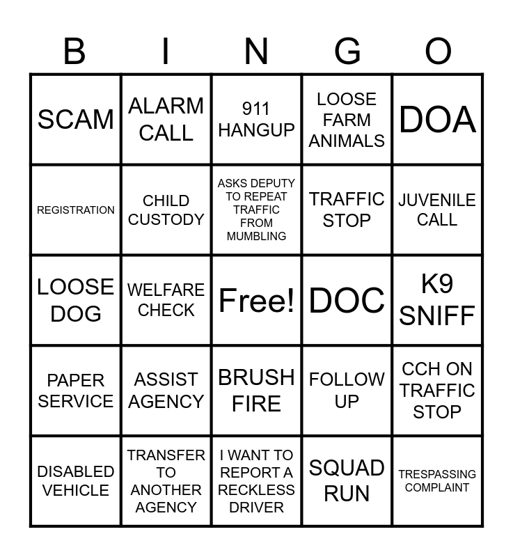 This bingo card has a free space and 24 words: ASSIST AGENCY, TRANSFER TO ANOTHER AGENCY, ASKS DEPUTY TO REPEAT TRAFFIC FROM MUMBLING, DISABLED VEHICLE, DOA, SCAM, REGISTRATION, ALARM CALL, DOC, BRUSH FIRE, TRAFFIC STOP, LOOSE DOG, FOLLOW UP, CCH ON TRAFFIC STOP, CHILD CUSTODY, SQUAD RUN, K9 SNIFF, 911 HANGUP, JUVENILE CALL, WELFARE CHECK, TRESPASSING COMPLAINT, PAPER SERVICE, LOOSE FARM ANIMALS and I WANT TO REPORT A RECKLESS DRIVER.