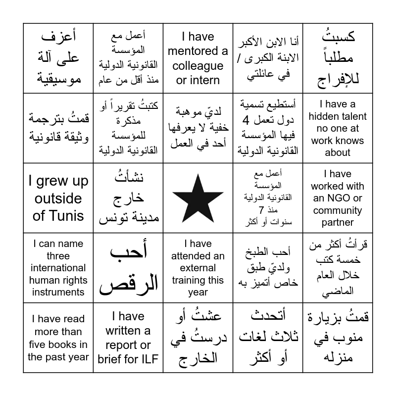 This bingo card has a free space and 48 words: عملتُ مع منظمة غير حكومية أو شريك مجتمعي, قمتُ بزيارة منوب في منزله, أنا أصغر الأبناء في عائلتي, عشتُ أو درستُ في الخارج, أحب الرقص, أستطيع تسمية ثلاث صكوك دولية لحقوق الإنسان, أعمل مع المؤسسة القانونية الدولية منذ أقل من عام, سافرتُ إلى أكثر من خمس دول, قمتُ بترجمة وثيقة قانونية, تعلمتُ شيئاً جديداً تماماً خلال الشهر الماضي, كتبتُ تقريراً أو مذكرة للمؤسسة القانونية الدولية, أنا الابن الأكبر / الابنة الكبرى في عائلتي, قرأتُ أكثر من خمسة كتب خلال العام الماضي, أحب الطبخ ولديّ طبق خاص أتميز به, حضرتُ تدريباً خارجياً هذا العام, لديّ خلفية أكاديمية في مجال غير القانون, لديّ موهبة خفية لا يعرفها أحد في العمل, أعمل مع المؤسسة القانونية الدولية منذ 7 سنوات أو أكثر, قمتُ بتوجيه زميل أو متدرب, كسبتُ مطلباً للإفراج, نشأتُ خارج مدينة تونس, أتحدث ثلاث لغات أو أكثر, أعزف على آلة موسيقية, أستطيع تسمية 4 دول تعمل فيها المؤسسة القانونية الدولية, I lived or studied abroad, I have a hidden talent no one at work knows about, I have read more than five books in the past year, I love to cook and have a signature dish, I have attended an external training this year, I can name three international human rights instruments, I have been with ILF for fewer than a year, I have traveled to more than five countries, I have translated a legal document, I learned something completely new in the past month, I have written a report or brief for ILF, I am the oldest child in my family, I am the youngest child in my family, I have worked with an NGO or community partner, I love to dance, I have an academic background outside of law, I have visited a client at their home, I have been with ILF for 7 or more years, I have mentored a colleague or intern, I have won a motion for release, I grew up outside of Tunis, I speak three or more languages, I play a musical instrument and I can name 4 countries where ILF operates.