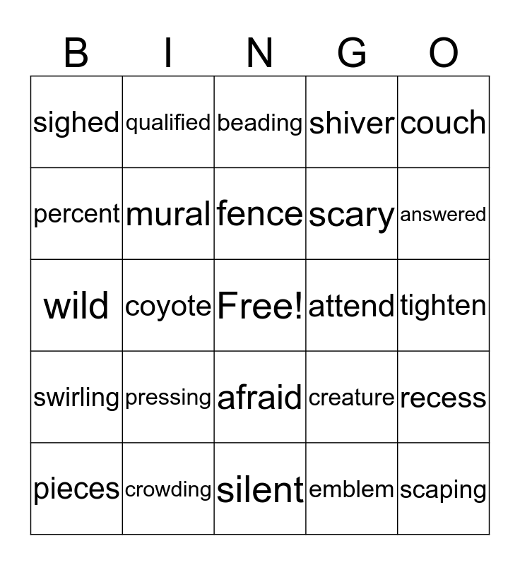 This bingo card has a free space and 24 words: pressing, crowding, fence, pieces, couch, sighed, percent, qualified, attend, afraid, scary, wild, creature, recess, mural, emblem, tighten, beading, answered, coyote, scaping, swirling, shiver and silent.