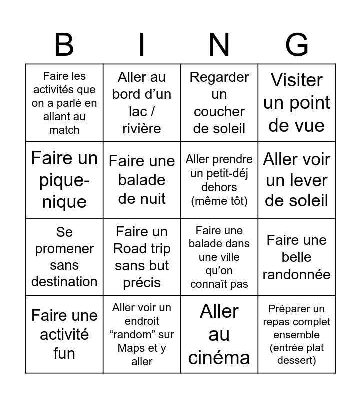 This bingo card has 16 words: Aller voir un endroit “random” sur Maps et y aller, Faire une belle randonnée, Regarder un coucher de soleil, Faire les activités que on a parlé en allant au match, Se promener sans destination, Aller au bord d’un lac / rivière, Faire une balade dans une ville qu’on connaît pas, Aller au cinéma, Faire un pique-nique, Faire une balade de nuit, Faire une activité fun, Visiter un point de vue, Faire un Road trip sans but précis, Aller voir un lever de soleil, Aller prendre un petit-déj dehors (même tôt) and Préparer un repas complet ensemble (entrée plat dessert).