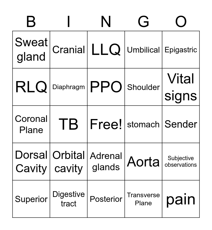 This bingo card has a free space and 24 words: Superior, Orbital cavity, PPO, Transverse Plane, Epigastric, Sweat gland, Cranial, LLQ, stomach, Sender, Coronal Plane, Diaphragm, Aorta, Subjective observations, RLQ, Digestive tract, Posterior, Umbilical, Vital signs, Dorsal Cavity, TB, Adrenal glands, Shoulder and pain.