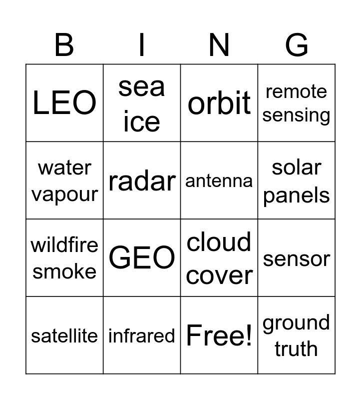 This bingo card has 17 words: Free!, satellite, orbit, LEO, GEO, remote sensing, sensor, antenna, solar panels, radar, infrared, cloud cover, water vapour, sea ice, wildfire smoke, land-use change and ground truth.