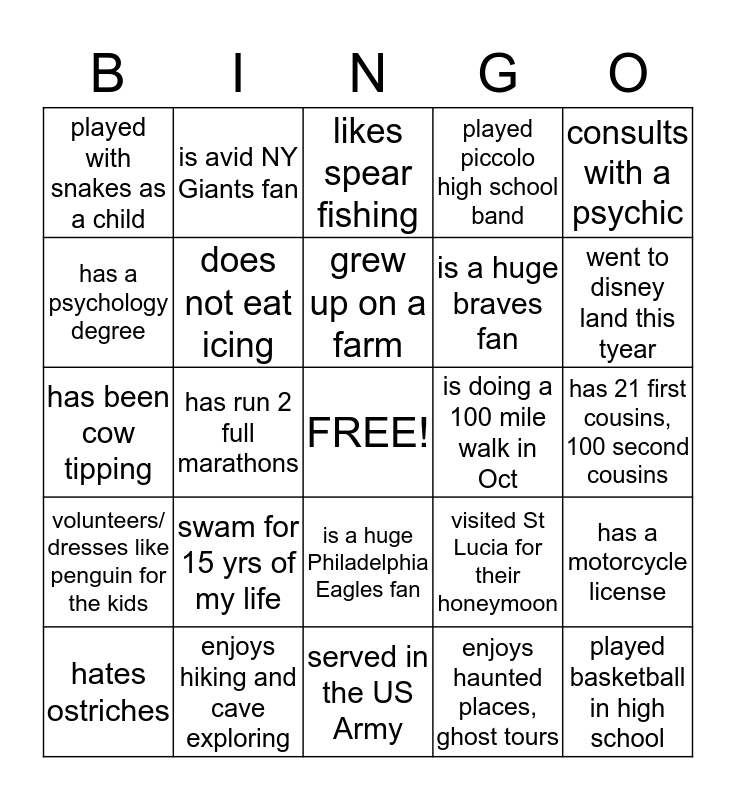 This bingo card has a free space and 24 words: swam for 15 yrs of my life, enjoys hiking and cave exploring, grew up on a farm, hates ostriches, consults with a psychic, played with snakes as a child, has a psychology degree, is avid NY Giants fan, is doing a 100 mile walk in Oct, is a huge Philadelphia Eagles fan, is a huge braves fan, has been cow tipping, visited St Lucia for their honeymoon, has a motorcycle license, does not eat icing, enjoys haunted places, ghost tours, has 21 first cousins, 100 second cousins, likes spear fishing, went to disney land this tyear, has run 2 full marathons, played basketball in high school, volunteers/ dresses like penguin for the kids, played piccolo high school band and served in the US Army.
