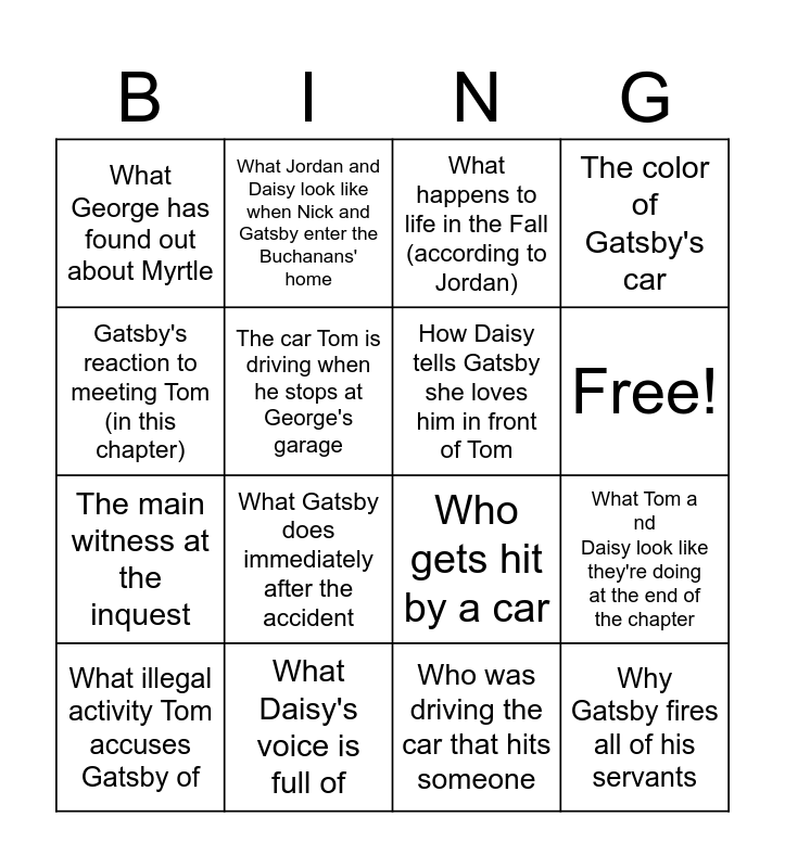 This bingo card has 17 words: Who was driving the car that hits someone, What illegal activity Tom accuses Gatsby of, What happens to life in the Fall (according to Jordan), What George has found out about Myrtle, What Gatsby does immediately after the accident, The color of Gatsby's car, What Tom and Daisy look like they're doing at the end of the chapter, How Daisy tells Gatsby she loves him in front of Tom, Free!, The car Tom is driving when he stops at George's garage, What Daisy's voice is full of, Who gets hit by a car, Gatsby's reaction to meeting Tom (in this chapter), What Jordan and Daisy look like when Nick and Gatsby enter the Buchanans' home, The main witness at the inquest, Why Tom lets Daisy leave with Gatsby from the hotel and Why Gatsby fires all of his servants.