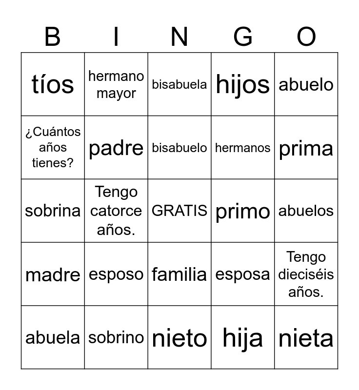 This bingo card has a free space and 34 words: hijo, hija, hermano, hermana, madre, padre, abuelo, abuela, hermano mayor, hermana menor, bisabuelo, bisabuela, tío, tía, primo, prima, sobrino, sobrina, esposo, esposa, familia, padres, tíos, abuelos, nieto, nieta, hijos, nietos, hermanos, ¿Cuántos años tienes?, Tengo quince años., Tengo catorce años., Tengo dieciséis años. and Tengo diecisiete años..