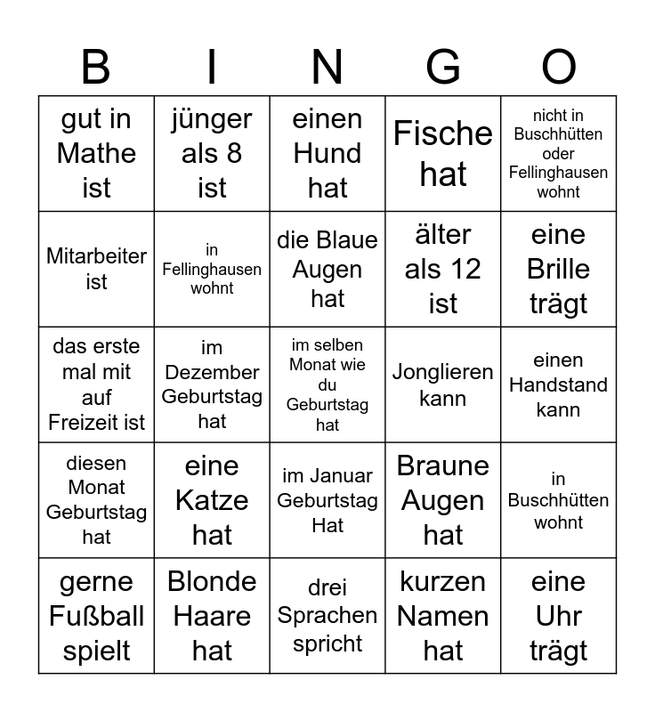 This bingo card has a free space and 24 words: eine Katze hat, Blonde Haare hat, die Blaue Augen hat, gerne Fußball spielt, nicht in Buschhütten oder Fellinghausen wohnt, gut in Mathe ist, Mitarbeiter ist, jünger als 8 ist, Jonglieren kann, im Januar Geburtstag Hat, älter als 12 ist, das erste mal mit auf Freizeit ist, Braune Augen hat, in Buschhütten wohnt, in Fellinghausen wohnt, kurzen Namen hat, einen Handstand kann, einen Hund hat, eine Brille trägt, im Dezember Geburtstag hat, eine Uhr trägt, diesen Monat Geburtstag hat, Fische hat and drei Sprachen spricht.