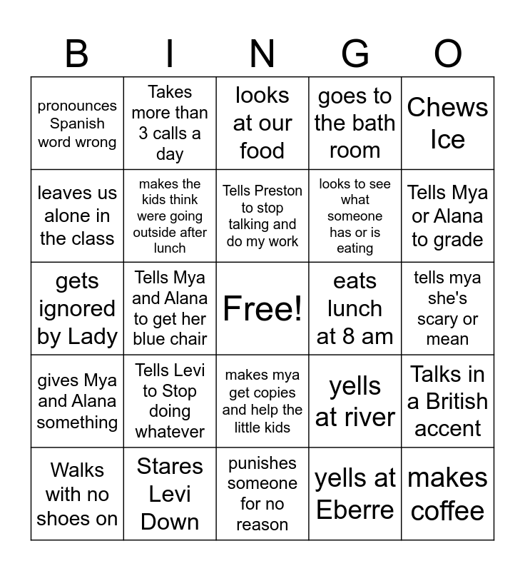 This bingo card has a free space and 24 words: Tells Levi to Stop doing whatever, Stares Levi Down, Tells Preston to stop talking and do my work, Walks with no shoes on, Chews Ice, pronounces Spanish word wrong, leaves us alone in the class, Takes more than 3 calls a day, eats lunch at 8 am, makes mya get copies and help the little kids, looks to see what someone has or is eating, gets ignored by Lady, yells at river, Talks in a British accent, makes the kids think were going outside after lunch, yells at Eberre, tells mya she's scary or mean, looks at our food, Tells Mya or Alana to grade, Tells Mya and Alana to get her blue chair, makes coffee, gives Mya and Alana something, goes to the bath room and punishes someone for no reason.