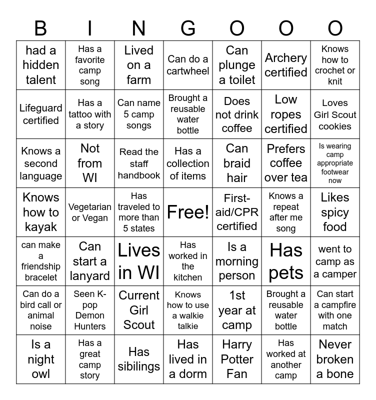 This bingo card has a free space and 48 words: 1st year at camp, Low ropes certified, Has lived in a dorm, Vegetarian or Vegan, Read the staff handbook, Likes spicy food, Has a favorite camp song, Has a great camp story, Archery certified, Has worked in the kitchen, Knows how to crochet or knit, Can do a cartwheel, Prefers coffee over tea, Can braid hair, Can do a bird call or animal noise, Knows a repeat after me song, Lifeguard certified, Loves Girl Scout cookies, Brought a reusable water bottle, Can plunge a toilet, Does not drink coffee, Has traveled to more than 5 states, had a hidden talent, Has a tattoo with a story, Can start a campfire with one match, Can name 5 camp songs, Is wearing camp appropriate footwear now, Is a night owl, Has a collection of items, Not from WI, Has worked at another camp, First-aid/CPR certified, went to camp as a camper, Seen K-pop Demon Hunters, Knows how to kayak, Is a morning person, Has pets, Knows a second language, Lives in WI, Current Girl Scout, can make a friendship bracelet, Never broken a bone, Lived on a farm, Has sibilings, Brought a reusable water bottle, Knows how to use a walkie talkie, Can start a lanyard and Harry Potter Fan.