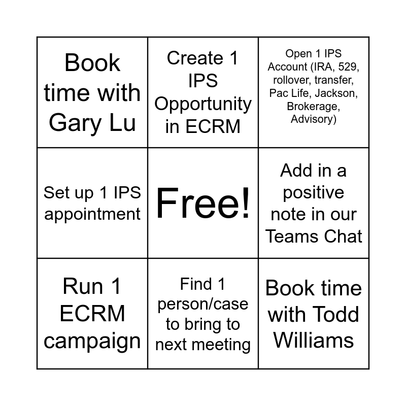 This bingo card has a free space and 8 words: Add in a positive note in our Teams Chat, Open 1 IPS Account (IRA, 529, rollover, transfer, Pac Life, Jackson, Brokerage, Advisory), Create 1 IPS Opportunity in ECRM, Run 1 ECRM campaign, Book time with Gary Lu, Book time with Todd Williams, Set up 1 IPS appointment and Find 1 person/case to bring to next meeting.