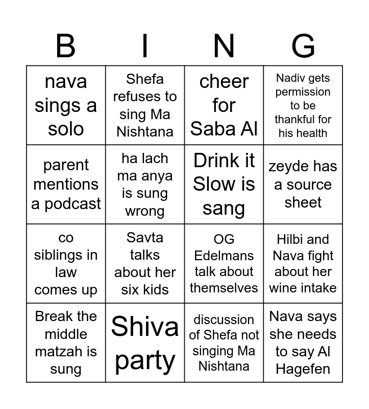 This bingo card has 26 words: Free!, adams 50th, zeyde has a source sheet, Zz says something crazy, parent mentions a podcast, nava sings a solo, ha lach ma anya is sung wrong, Shefa refuses to sing Ma Nishtana, discussion of Shefa not singing Ma Nishtana, Ephie attempts zoom style singing, co siblings in law comes up, OG Edelmans talk about themselves, ICE, Erica cries, Hilbi and Nava fight about her wine intake, Shefa gets permission to be thankful for her health, Nadiv gets permission to be thankful for his health, Nava says she needs to say Al Hagefen, cheer for Saba Al, Break the middle matzah is sung, Savta talks about her six kids, "I didn't like her but I loved her" comes up, Shiva party, Bubbie thanking Erica always, Drink it Slow is sang and Savta talks about her trips.