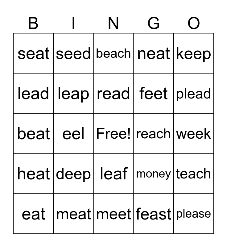 This bingo card has a free space and 27 words: money, each, feet, meet, lead, beach, seed, heat, reach, teach, beat, neat, eat, meat, plead, bead, leap, read, deep, seat, week, feast, eel, please, leaf, keep and weak.