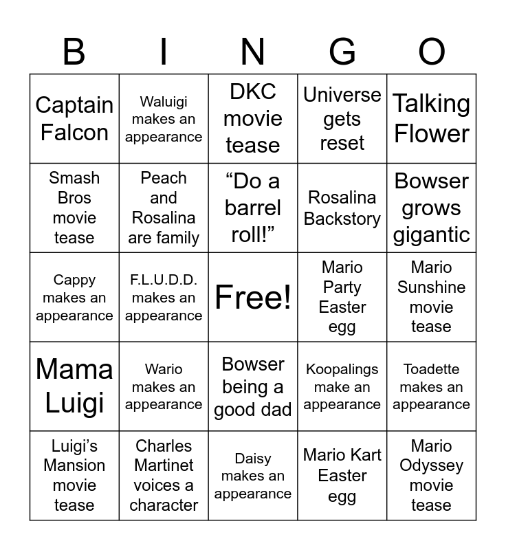 This bingo card has a free space and 24 words: Wario makes an appearance, Charles Martinet voices a character, “Do a barrel roll!”, Luigi’s Mansion movie tease, Talking Flower, Captain Falcon, Smash Bros movie tease, Waluigi makes an appearance, Mario Party Easter egg, Bowser being a good dad, Rosalina Backstory, Cappy makes an appearance, Koopalings make an appearance, Toadette makes an appearance, Peach and Rosalina are family, Mario Kart Easter egg, Mario Sunshine movie tease, DKC movie tease, Bowser grows gigantic, F.L.U.D.D. makes an appearance, Mario Odyssey movie tease, Mama Luigi, Universe gets reset and Daisy makes an appearance.