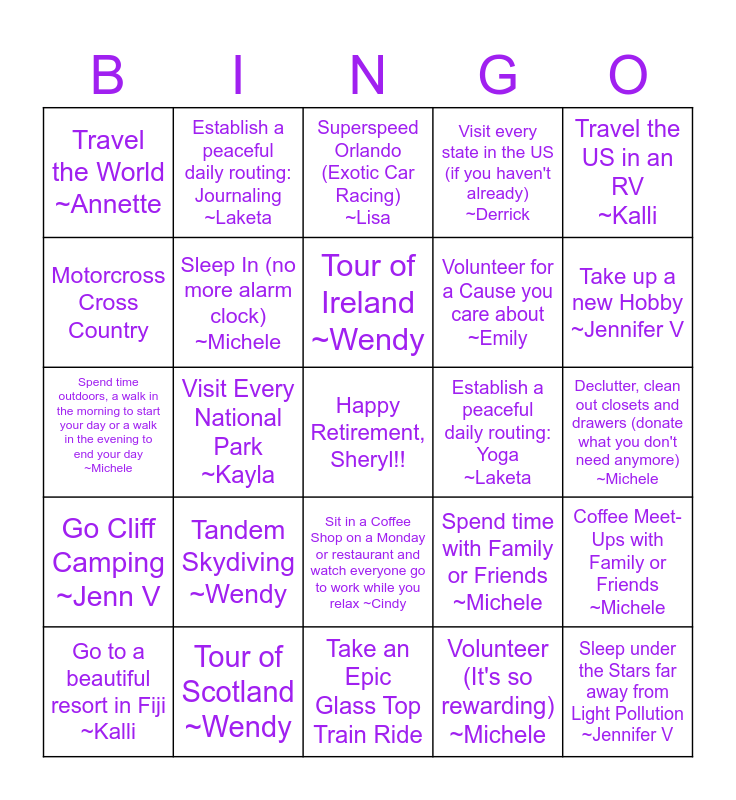 This bingo card has a free space and 24 words: Tandem Skydiving ~Wendy, Tour of Scotland ~Wendy, Tour of Ireland ~Wendy, Go to a beautiful resort in Fiji ~Kalli, Travel the US in an RV ~Kalli, Travel the World ~Annette, Motorcross Cross Country, Establish a peaceful daily routing: Journaling ~Laketa, Establish a peaceful daily routing: Yoga ~Laketa, Sit in a Coffee Shop on a Monday or restaurant and watch everyone go to work while you relax ~Cindy, Volunteer for a Cause you care about ~Emily, Spend time outdoors, a walk in the morning to start your day or a walk in the evening to end your day ~Michele, Spend time with Family or Friends ~Michele, Coffee Meet-Ups with Family or Friends ~Michele, Sleep In (no more alarm clock) ~Michele, Volunteer (It's so rewarding) ~Michele, Declutter, clean out closets and drawers (donate what you don't need anymore) ~Michele, Superspeed Orlando (Exotic Car Racing) ~Lisa, Take up a new Hobby ~Jennifer V, Visit Every National Park ~Kayla, Sleep under the Stars far away from Light Pollution ~Jennifer V, Go Cliff Camping ~Jenn V, Visit every state in the US (if you haven't already) ~Derrick and Take an Epic Glass Top Train Ride.