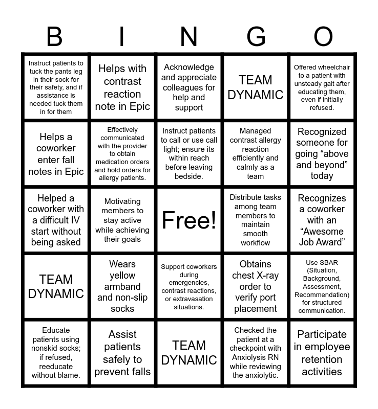 This bingo card has a free space and 24 words: Wears yellow armband and non-slip socks, Assist patients safely to prevent falls, Instruct patients to call or use call light; ensure its within reach before leaving bedside., Educate patients using nonskid socks; if refused, reeducate without blame., Offered wheelchair to a patient with unsteady gait after educating them, even if initially refused., Instruct patients to tuck the pants leg in their sock for their safety, and if assistance is needed tuck them in for them, Helps a coworker enter fall notes in Epic, Helps with contrast reaction note in Epic, Distribute tasks among team members to maintain smooth workflow, Support coworkers during emergencies, contrast reactions, or extravasation situations., Managed contrast allergy reaction efficiently and calmly as a team, Helped a coworker with a difficult IV start without being asked, Obtains chest X-ray order to verify port placement, Use SBAR (Situation, Background, Assessment, Recommendation) for structured communication., Effectively communicated with the provider to obtain medication orders and hold orders for allergy patients., Checked the patient at a checkpoint with Anxiolysis RN while reviewing the anxiolytic., Recognizes a coworker with an “Awesome Job Award”, Acknowledge and appreciate colleagues for help and support, Recognized someone for going “above and beyond” today, Motivating members to stay active while achieving their goals, Participate in employee retention activities, TEAM DYNAMIC, TEAM DYNAMIC and TEAM DYNAMIC.