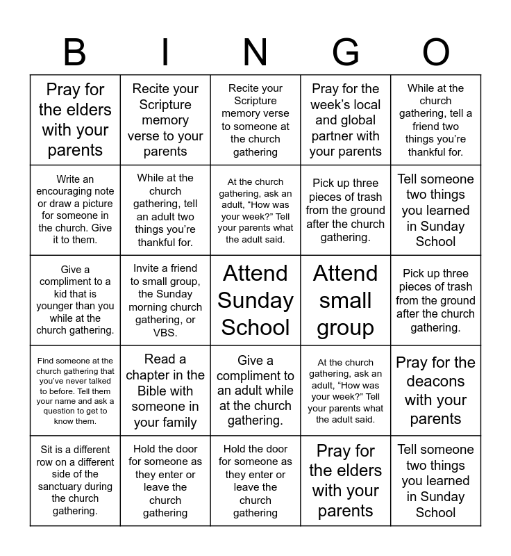 This bingo card has a free space and 24 words: Read a chapter in the Bible with someone in your family, Hold the door for someone as they enter or leave the church gathering, At the church gathering, ask an adult, “How was your week?” Tell your parents what the adult said., Sit is a different row on a different side of the sanctuary during the church gathering., While at the church gathering, tell a friend two things you’re thankful for., Pray for the elders with your parents, Write an encouraging note or draw a picture for someone in the church. Give it to them., Recite your Scripture memory verse to your parents, Attend small group, Give a compliment to an adult while at the church gathering., Pick up three pieces of trash from the ground after the church gathering., Give a compliment to a kid that is younger than you while at the church gathering., At the church gathering, ask an adult, “How was your week?” Tell your parents what the adult said., Pray for the deacons with your parents, While at the church gathering, tell an adult two things you’re thankful for., Pray for the elders with your parents, Pick up three pieces of trash from the ground after the church gathering., Recite your Scripture memory verse to someone at the church gathering, Tell someone two things you learned in Sunday School, Invite a friend to small group, the Sunday morning church gathering, or VBS., Tell someone two things you learned in Sunday School, Find someone at the church gathering that you’ve never talked to before. Tell them your name and ask a question to get to know them., Pray for the week’s local and global partner with your parents and Hold the door for someone as they enter or leave the church gathering.