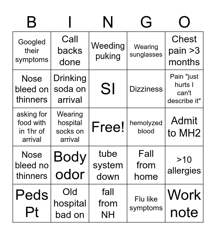 This bingo card has a free space and 37 words: Asks doctor for blanket, Cardiac arrest, AMA, Drinking soda on arrival, >10 allergies, Body odor, SI, Patient refused meds, Chest pain >3 months, Arriving on cell phone, Wearing hospital socks on arrival, Wearing sunglasses, Work note, Admit to MH2, Nose bleed on thinners, Nose bleed no thinners, I need the med that starts with "D", Weeding puking, tube system down, hemolyzed blood, Googled their symptoms, Pain "just hurts I can't describe it", Peds Pt, fall from NH, CCT, Flu like symptoms, Call backs done, mask on wrong, sepsis alert, Stroke, laceration, Old hospital bad on, asking for food with in 1hr of arrival, SOB, Fall from home, Dizziness and foot pain.