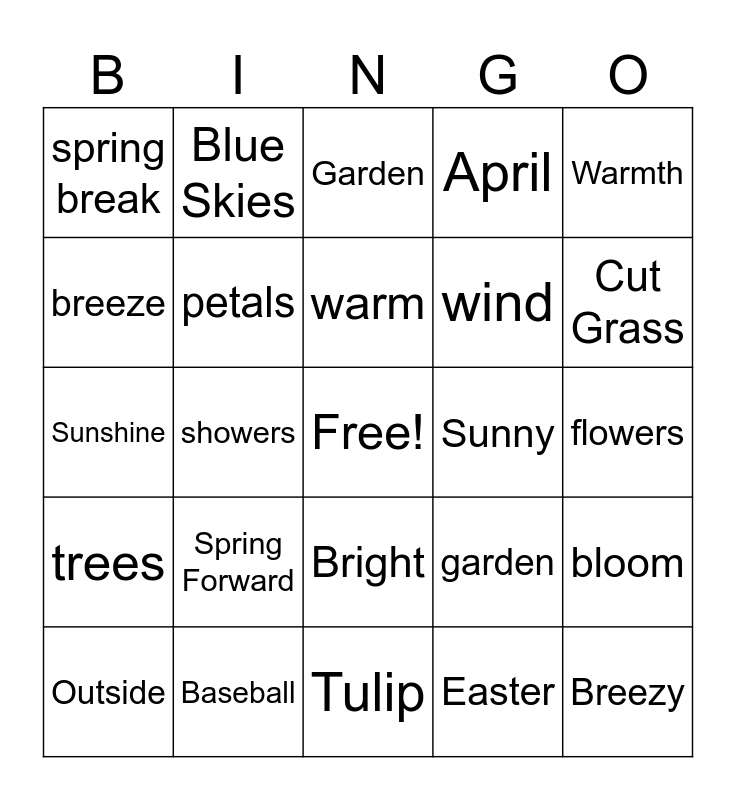 This bingo card has a free space and 44 words: Spring Break, Breezy, Flowers, Outside, St. Patrick's Day, Easter, Garden, March, Warmth, Baseball, April, Sunny, Bright, Spring Forward, May, Tulip, Spring Showers, Sunshine, Spring Cleaning, Cut Grass, Blue Skies, Bunnies, spring, spring break, butterflies, flowers, rainbow, fresh, garden, trees, blossom, bloom, picnics, kites, showers, grass, baseball, tulip, warm, breeze, wind, windy, petals and bees.