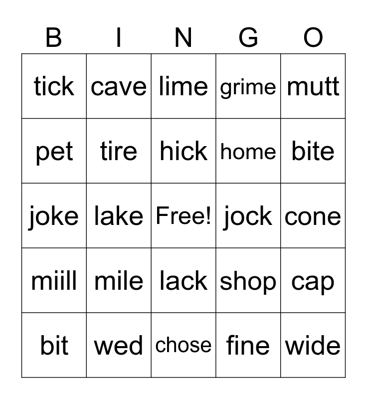 This bingo card has a free space and 63 words: cape, con, hike, cap, mute, cut, cave, hive, hick, Pete, lack, hole, cone, mutt, take, pet, lake, tick, cute, home, mile, miill, grime, grim, hid, hide, pine, pin, Sid, sid, pip, pipe, rid, ride, bite, bit, fin, fine, time, tire, joke, jock, kite, kit, wide, wed, shape, shop, trike, trick, bride, chose, dine, drove, Jane, lime, hose, grove, note, poke, probe, pure and shine.