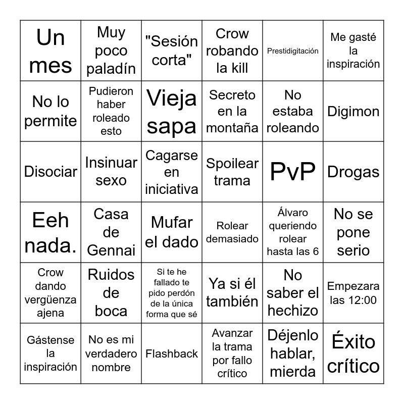 This bingo card has 36 words: Ya si él también, Si te he fallado te pido perdón de la única forma que sé, Avanzar la trama por fallo crítico, No lo permite, Eeh nada., Spoilear trama, Pudieron haber roleado esto, Flashback, Prestidigitación, No saber el hechizo, Digimon, Crow robando la kill, Empezara las 12:00, Insinuar sexo, Secreto en la montaña, Un mes, Crow dando vergüenza ajena, PvP, Disociar, "Sesión corta", Cagarse en iniciativa, Casa de Gennai, Rolear demasiado, Mufar el dado, Álvaro queriendo rolear hasta las 6, Muy poco paladín, No estaba roleando, No es mi verdadero nombre, Vieja sapa, Me gasté la inspiración, Éxito crítico, Gástense la inspiración, No se pone serio, Drogas, Ruidos de boca and Déjenlo hablar, mierda.