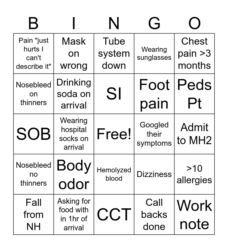 This bingo card has a free space and 37 words: Asks doctor for blanket, Cardiac arrest, AMA, Drinking soda on arrival, >10 allergies, Body odor, SI, Patient refused meds, Chest pain >3 months, Arriving on cell phone, Wearing hospital socks on arrival, Wearing sunglasses, Work note, Admit to MH2, Nosebleed on thinners, Nosebleed no thinners, I need the med that starts with "D", Tube system down, Hemolyzed blood, Googled their symptoms, Pain "just hurts I can't describe it", Peds Pt, Fall from NH, CCT, Flu like symptoms, Call backs done, Mask on wrong, Sepsis alert, Stroke, Laceration, Old hospital bad on, Asking for food with in 1hr of arrival, SOB, Fall from home, Dizziness, Foot pain and UTI symptoms.