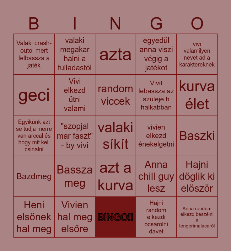 This bingo card has 25 words: Bazdmeg, Vivien hal meg elsőre, valaki síkít, Hajni random elkezdi ocsarolni davet, vivi valamilyen nevet ad a karaktereknek, Valaki crash-outol mert felbassza a jaték, valaki megakar halni a fulladastól, azta, vivien elkezd énekelgetni, Hajni döglik ki elöször, geci, Vivi elkezd ütni valami, BINGO!!, Anna chill guy lesz, kurva élet, Heni elsőnek hal meg, "szopjal mar faszt" - by vivi, random viccek, Vivit lebassza az szüleje h halkabban, Baszki, Egyikünk azt se tudja merre van arccal és hogy mit kell csinalni, Bassza meg, azt a kurva, egyedül anna viszi végig a jatékot and Anna random elkezd beszélni a tengerimalacaról.