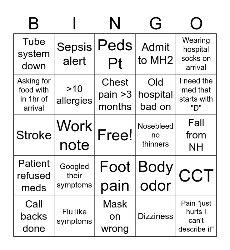 This bingo card has a free space and 36 words: Asks doctor for blanket, AMA, Drinking soda on arrival, >10 allergies, Body odor, Patient refused meds, Chest pain >3 months, Arriving on cell phone, Wearing hospital socks on arrival, Wearing sunglasses, Work note, Admit to MH2, Nosebleed on thinners, Nosebleed no thinners, I need the med that starts with "D", Tube system down, Hemolyzed blood, Googled their symptoms, Pain "just hurts I can't describe it", Peds Pt, Fall from NH, CCT, Flu like symptoms, Call backs done, Mask on wrong, Sepsis alert, Stroke, Laceration, Old hospital bad on, Asking for food with in 1hr of arrival, SOB, Fall from home, Dizziness, Foot pain, UTI symptoms and Back Pain.