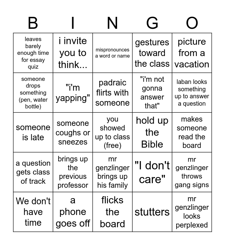 This bingo card has a free space and 32 words: stutters, mr genzlinger unintentionally flips us off, someone coughs or sneezes, i'm gonna move on, a question gets class of track, "i'm yapping", picture from a vacation, mr genzlinger throws gang signs, i invite you to think..., you get below a C on the reading quiz, padraic flirts with someone, mispronounces a word or name, "demoned", uses a student in a scenario, hold up the Bible, "we'll get into that later", We don't have time, someone is late, mr genzlinger brings up his family, brings up the previous professor, "I don't care", we could talk about this forever, makes someone read the board, a phone goes off, mr genzlinger looks perplexed, gestures toward the class, "i'm not gonna answer that", someone drops something (pen, water bottle), leaves barely enough time for essay quiz, flicks the board, mr genzlinger almost is sacreligious and laban looks something up to answer a question.