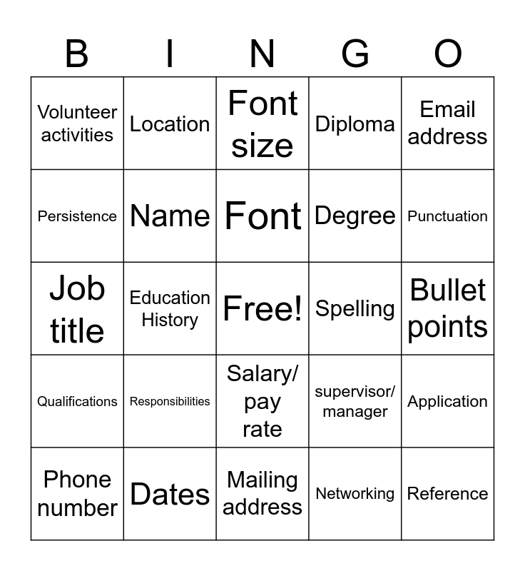 This bingo card has a free space and 33 words: Contact Information, Employment History, Education History, Skills, Qualifications, Name, Email address, Phone number, Location, Margins, Font, Font size, Proofread, Format, Spelling, Punctuation, Dates, Job title, Responsibilities, supervisor/ manager, Salary/ pay rate, hours per week, Volunteer activities, Bullet points, Mailing address, Reference, Diploma, Degree, Persistence, Application, Job Posting, Networking and Indeed.com.