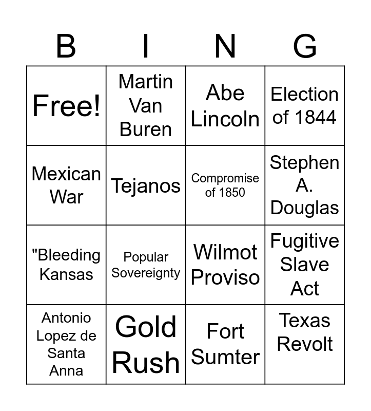 This bingo card has 16 words: Antonio Lopez de Santa Anna, Gold Rush, Abe Lincoln, Election of 1844, Mexican War, Martin Van Buren, Wilmot Proviso, Fugitive Slave Act, Free!, Tejanos, Fort Sumter, Stephen A. Douglas, "Bleeding Kansas, Popular Sovereignty, Compromise of 1850 and Texas Revolt.