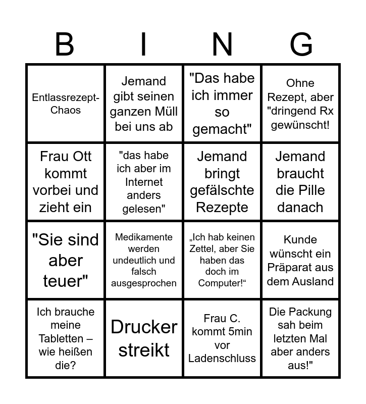 This bingo card has 16 words: Ich brauche meine Tabletten – wie heißen die?, Drucker streikt, "Das habe ich immer so gemacht", Ohne Rezept, aber "dringend Rx gewünscht!, Frau Ott kommt vorbei und zieht ein, Jemand gibt seinen ganzen Müll bei uns ab, „Ich hab keinen Zettel, aber Sie haben das doch im Computer!“, Kunde wünscht ein Präparat aus dem Ausland, Entlassrezept-Chaos, "das habe ich aber im Internet anders gelesen", Frau C. kommt 5min vor Ladenschluss, Jemand braucht die Pille danach, "Sie sind aber teuer", Medikamente werden undeutlich und falsch ausgesprochen, Jemand bringt gefälschte Rezepte and Die Packung sah beim letzten Mal aber anders aus!".