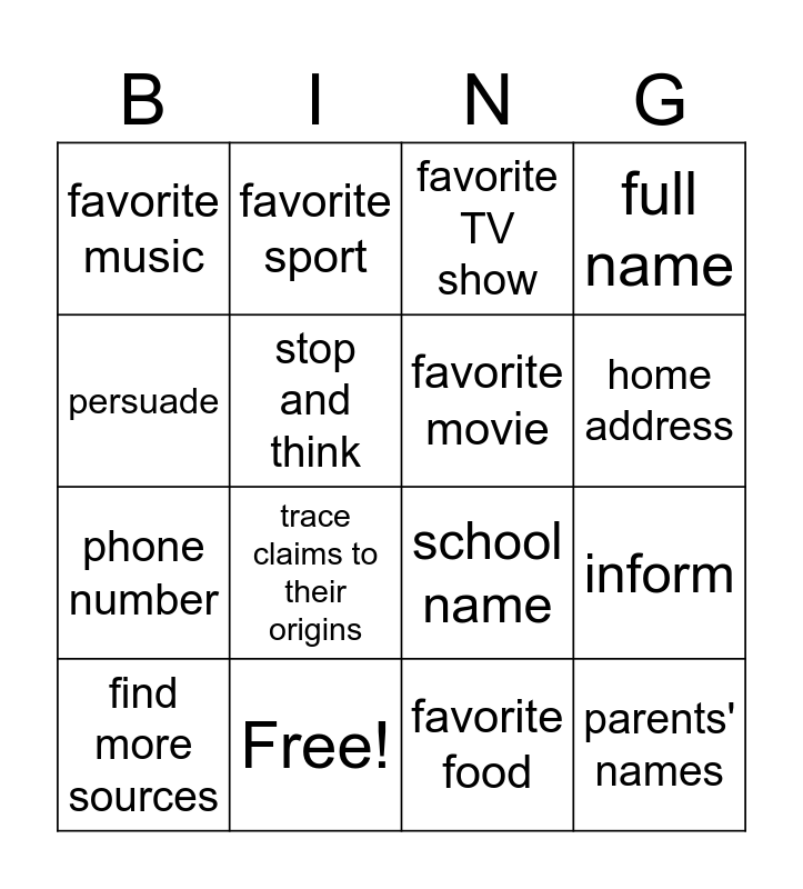 This bingo card has 21 words: Free!, hobby, favorite sport, pet, favorite food, favorite movie, favorite music, favorite TV show, school name, home address, phone number, full name, parents' names, banking information, stop and think, investigate the source, find more sources, trace claims to their origins, persuade, inform and entertain.