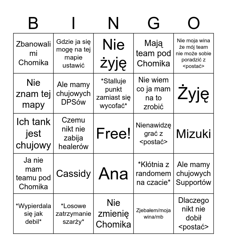 This bingo card has a free space and 24 words: Cassidy, *Losowe zatrzymanie szarży*, *Stalluje punkt zamiast się wycofać*, *Wypierdala się jak debil*, Nie moja wina że mój team nie może sobie poradzić z <postać>, Zbanowali mi Chomika, Nie znam tej mapy, Gdzie ja się mogę na tej mapie ustawić, Nienawidzę grać z <postać>, Ana, Nie wiem co ja mam na to zrobić, Ich tank jest chujowy, *Kłótnia z randomem na czacie*, Ale mamy chujowych Supportów, Ale mamy chujowych DPSów, Zjebałem/moja wina/mb, Mizuki, Nie żyję, Żyję, Czemu nikt nie zabija healerów, Dlaczego nikt nie dobił <postać>, Ja nie mam teamu pod Chomika, Mają team pod Chomika and Nie zmienię Chomika.