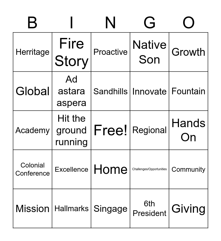 This bingo card has a free space and 24 words: Excellence, Hallmarks, Sandhills, Mission, Growth, Herritage, Global, Fire Story, Regional, Home, Innovate, Academy, Challenges/Opportunities, Community, Ad astara aspera, 6th President, Hands On, Proactive, Fountain, Hit the ground running, Giving, Colonial Conference, Native Son and Singage.