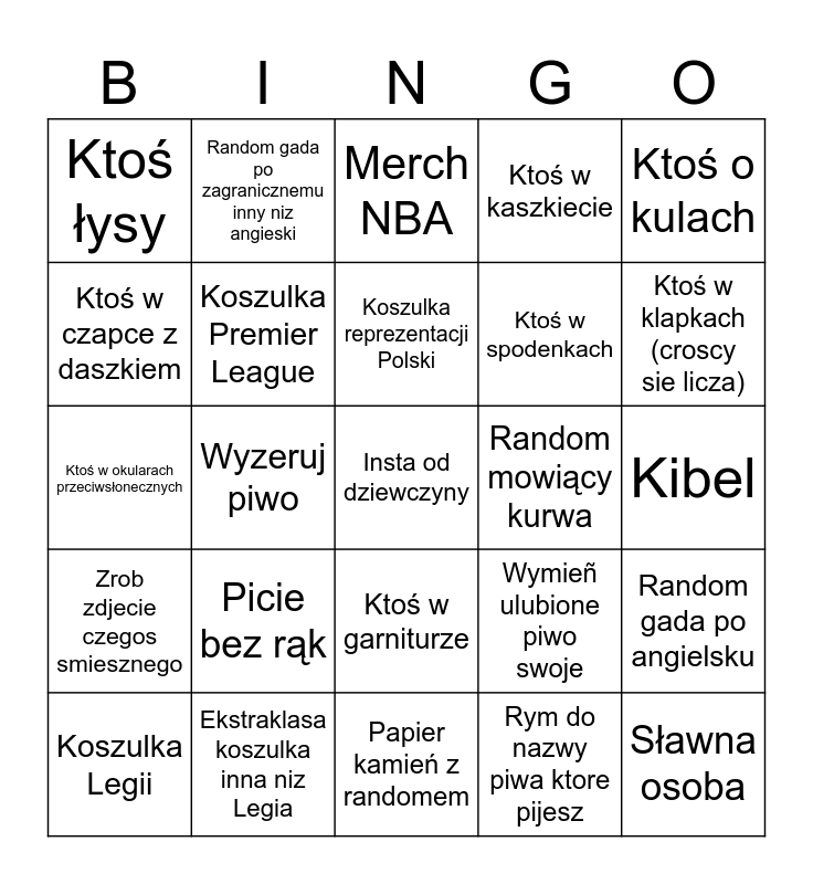 This bingo card has 25 words: Picie bez rąk, Papier kamień z randomem, Koszulka reprezentacji Polski, Koszulka Legii, Ktoś o kulach, Ktoś łysy, Ktoś w czapce z daszkiem, Random gada po zagranicznemu inny niz angieski, Random mowiący kurwa, Ktoś w garniturze, Ktoś w spodenkach, Ktoś w okularach przeciwsłonecznych, Wymieñ ulubione piwo swoje, Random gada po angielsku, Koszulka Premier League, Sławna osoba, Kibel, Merch NBA, Ktoś w klapkach (croscy sie licza), Wyzeruj piwo, Insta od dziewczyny, Ekstraklasa koszulka inna niz Legia, Zrob zdjecie czegos smiesznego, Ktoś w kaszkiecie and Rym do nazwy piwa ktore pijesz.