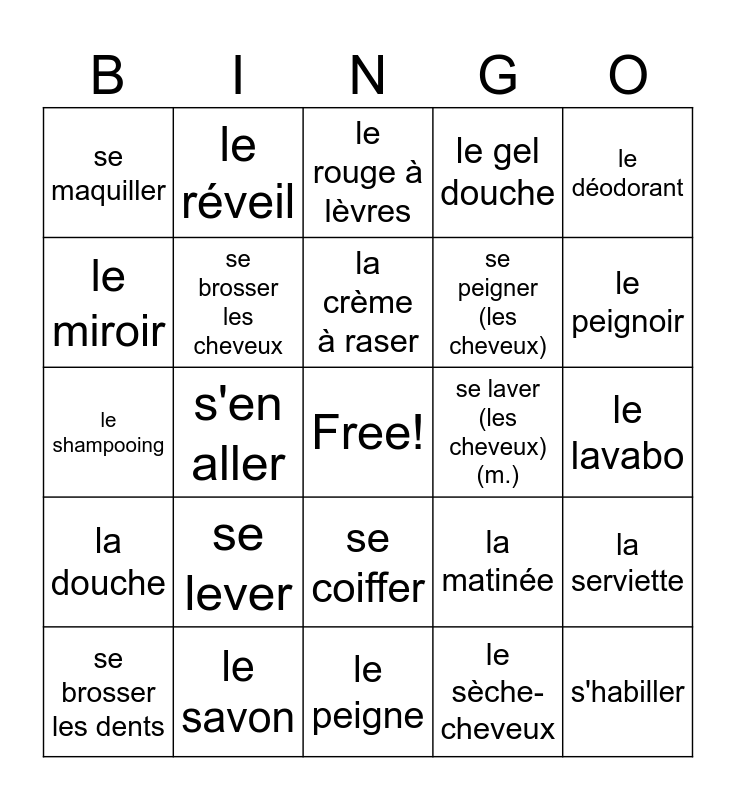 This bingo card has a free space and 39 words: la baignoire, la brosse, la brosse à dents, se brosser les cheveux, se brosser les dents, se coiffer, la crème à raser, le dentifrice, le déodorant, la douche, s'en aller, le gel douche, s'habiller, le lavabo, se laver (les cheveux) (m.), se lever, le maquillage, se maquiller, le mascara, la matinée, le miroir, le peigne, se peigner (les cheveux), le peignoir, prendre un bain, prendre une douche, se préparer, se raser, le rasoir (électrique), le réveil, le robinet, se réveiller, le rouge à lèvres, le savon, le sèche-cheveux, se sécher les cheveux (m.), la serviette, le shampooing and sonner.