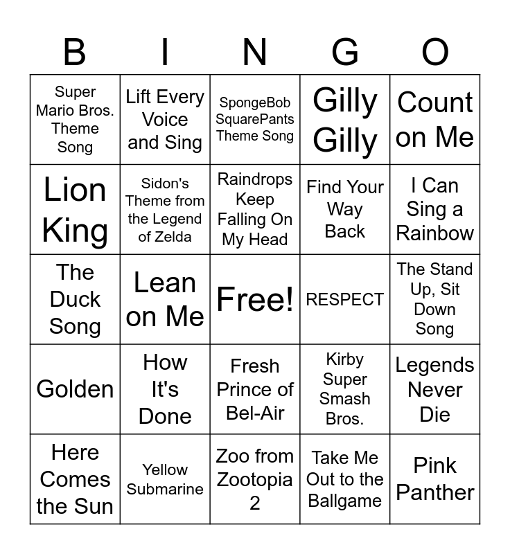 This bingo card has a free space and 24 words: How It's Done, Yellow Submarine, Raindrops Keep Falling On My Head, Here Comes the Sun, Count on Me, Super Mario Bros. Theme Song, Lion King, Lift Every Voice and Sing, RESPECT, Fresh Prince of Bel-Air, Find Your Way Back, The Duck Song, Kirby Super Smash Bros., Legends Never Die, Sidon's Theme from the Legend of Zelda, Take Me Out to the Ballgame, The Stand Up, Sit Down Song, SpongeBob SquarePants Theme Song, I Can Sing a Rainbow, Lean on Me, Pink Panther, Golden, Gilly Gilly and Zoo from Zootopia 2.
