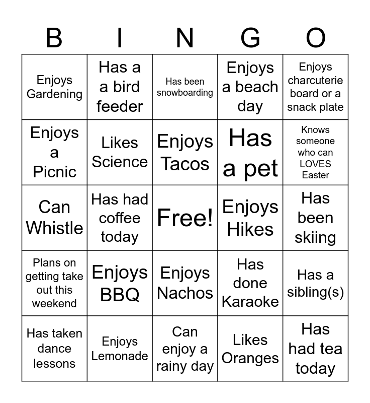 This bingo card has a free space and 24 words: Enjoys BBQ, Enjoys Lemonade, Enjoys Tacos, Has taken dance lessons, Enjoys charcuterie board or a snack plate, Enjoys Gardening, Enjoys a Picnic, Has a a bird feeder, Enjoys Hikes, Enjoys Nachos, Has a pet, Can Whistle, Has done Karaoke, Has a sibling(s), Likes Science, Likes Oranges, Has been skiing, Has been snowboarding, Knows someone who can LOVES Easter, Has had coffee today, Has had tea today, Plans on getting take out this weekend, Enjoys a beach day and Can enjoy a rainy day.