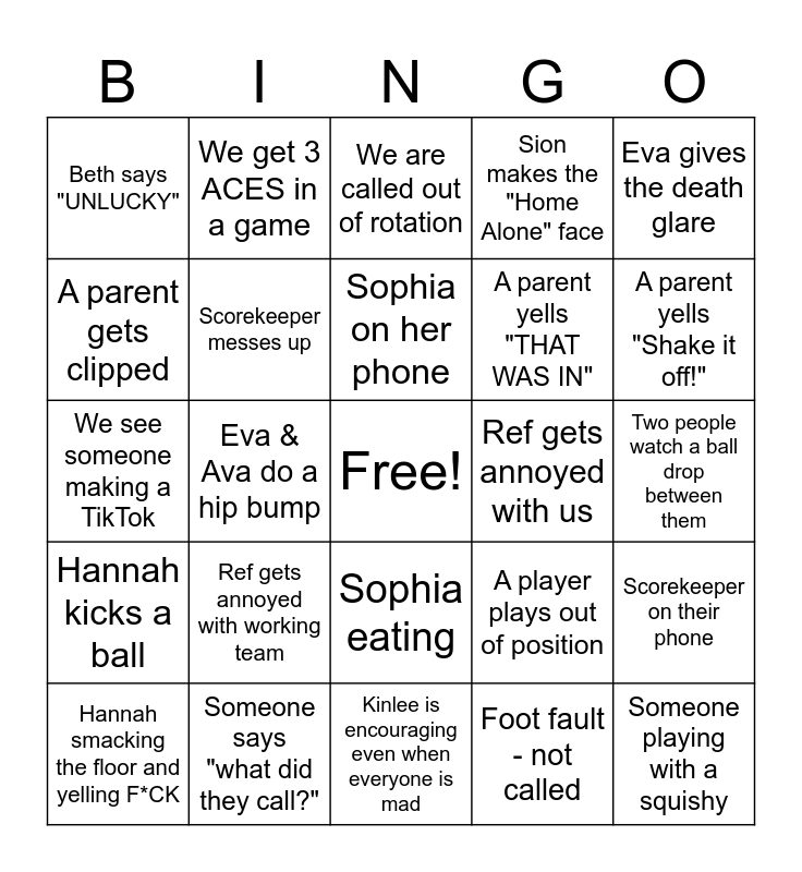 This bingo card has a free space and 39 words: court running ahead, court running behind, Sweatshirt costs over $60, Scorekeeper messes up, Hannah smacking the floor and yelling F*CK, Sophia eating, Sophia on her phone, Claire says the F word, Eva gives the death glare, Hannah kicks a ball, Eva & Ava do a hip bump, Sion makes the "Home Alone" face, Someone playing with a squishy, Two people watch a ball drop between them, Ref gets annoyed with us, Ref gets annoyed with working team, We play another NC team, Beth says "UNLUCKY", A player asks for water from the bench, A player plays out of position, A parent gets clipped, Kinlee is encouraging even when everyone is mad, A parent yells "THAT WAS IN", A parent yells "Shake it off!", A parent from another team won't leave our seats, Carolyn has a cheerleader moment, Ava does a full roll, Jordan gets a kill, Rayne gets a setter dump, We get 3 ACES in a game, We take a game to 3 sets, Hotel loses power, We are called out of rotation, Someone says "what did they call?", Foot fault - not called, Someone asks "who won the first set" when we're waiting on a court, Scorekeeper on their phone, We see someone making a TikTok and The girls make a barstool post.