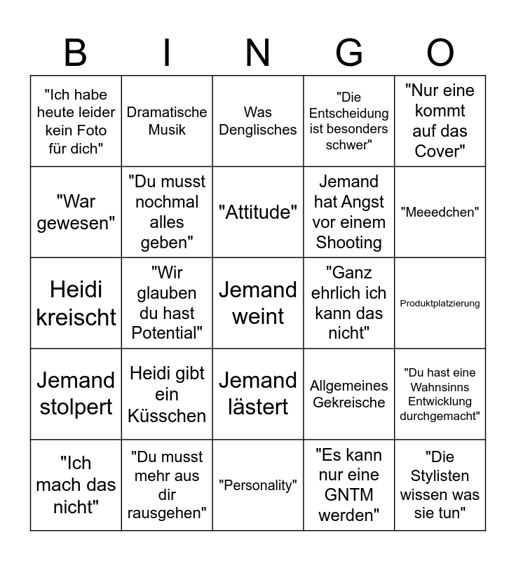 This bingo card has 25 words: Jemand stolpert, "Du musst mehr aus dir rausgehen", Jemand weint, "Es kann nur eine GNTM werden", "Nur eine kommt auf das Cover", "Ich habe heute leider kein Foto für dich", Dramatische Musik, Was Denglisches, "Ganz ehrlich ich kann das nicht", "Du hast eine Wahnsinns Entwicklung durchgemacht", "War gewesen", "Du musst nochmal alles geben", "Personality", Allgemeines Gekreische, "Meeedchen", "Ich mach das nicht", "Wir glauben du hast Potential", "Attitude", Jemand hat Angst vor einem Shooting, Produktplatzierung, Heidi kreischt, Heidi gibt ein Küsschen, Jemand lästert, "Die Entscheidung ist besonders schwer" and "Die Stylisten wissen was sie tun".