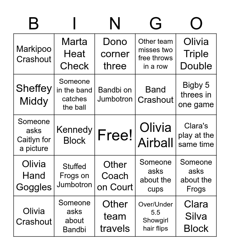 This bingo card has a free space and 24 words: Stuffed Frogs on Jumbotron, Someone asks about Bandbi, Bandbi on Jumbotron, Olivia Crashout, Olivia Triple Double, Markipoo Crashout, Sheffey Middy, Marta Heat Check, Olivia Airball, Other Coach on Court, Band Crashout, Someone asks Caitlyn for a picture, Someone asks about the cups, Someone asks about the Frogs, Someone in the band catches the ball, Over/Under 5.5 Showgirl hair flips, Clara's play at the same time, Dono corner three, Bigby 5 threes in one game, Kennedy Block, Clara Silva Block, Olivia Hand Goggles, Other team misses two free throws in a row and Other team travels.