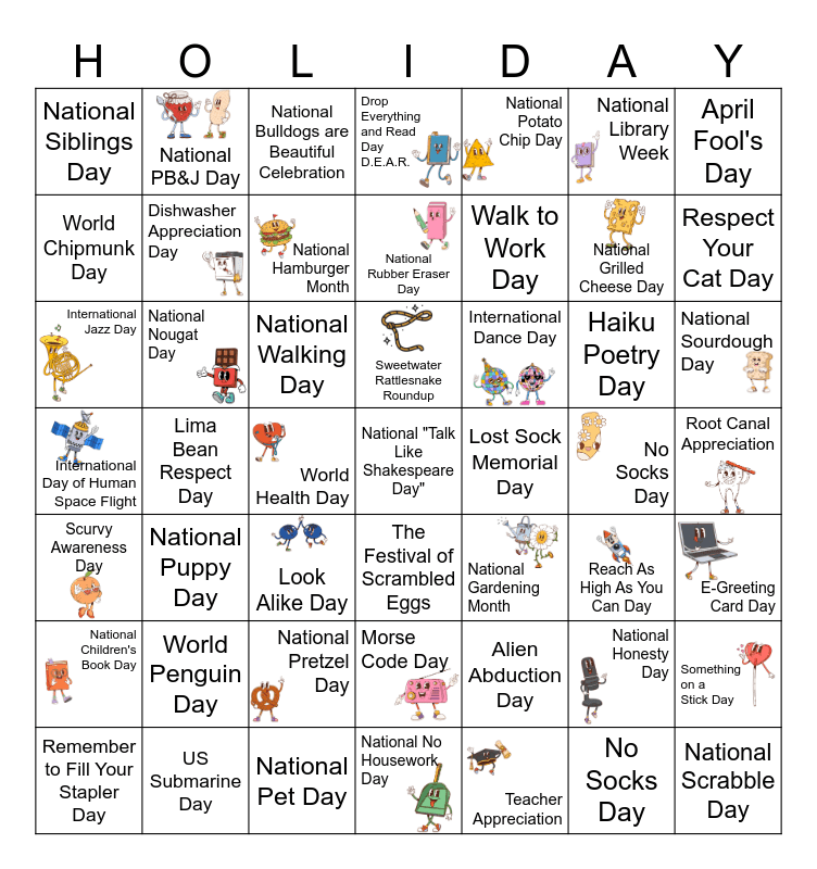 This bingo card has 30 images and 53 words: National Pet Day, National Grilled Cheese Day, Arbor Day, World Health Day, National Walking Day, E-Greeting Card Day, National PB&J Day, National Scrabble Day, National Library Week, National Children's Book Day, April Fool's Day, National Gardening Month, Haiku Poetry Day, International Dance Day, National Honesty Day, National Sourdough Day, World Chipmunk Day, Respect Your Cat Day, National No Housework Day, National Potato Chip Day, Walk to Work Day, National "Talk Like Shakespeare Day", Dishwasher Appreciation Day, National Siblings Day, Teacher Appreciation, International Day of Human Space Flight, Scurvy Awareness Day, No Socks Day, Root Canal Appreciation, National Hamburger Month, May the 4th Be With You -Star Wars Day-, The Festival of Scrambled Eggs, Alien Abduction Day, Something on a Stick Day, Reach As High As You Can Day, National Puppy Day, Drop Everything and Read Day D.E.A.R., Lima Bean Respect Day, National Bulldogs are Beautiful Celebration, World Penguin Day, National Pretzel Day, Morse Code Day, International Jazz Day, What if Cats & Dogs Had Opposable Thumbs Day, Remember to Fill Your Stapler Day, Sweetwater Rattlesnake Roundup, No Socks Day, Look Alike Day, National Rubber Eraser Day, National Nougat Day, US Submarine Day, Lost Sock Memorial Day and Dance Like a Chicken Day.