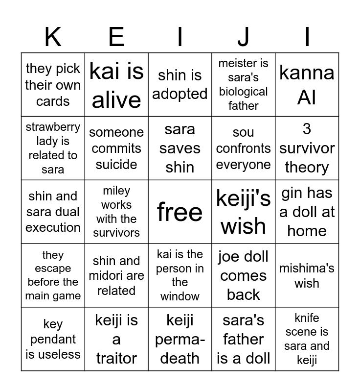 This bingo card has a free space and 24 words: shin and midori are related, keiji is a traitor, sara saves shin, key pendant is useless, kanna AI, they pick their own cards, strawberry lady is related to sara, kai is alive, keiji's wish, kai is the person in the window, sou confronts everyone, shin and sara dual execution, joe doll comes back, mishima's wish, someone commits suicide, sara's father is a doll, gin has a doll at home, shin is adopted, 3 survivor theory, miley works with the survivors, knife scene is sara and keiji, they escape before the main game, meister is sara's biological father and keiji perma- death.