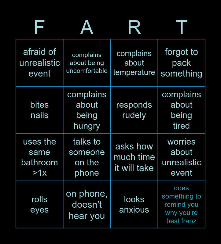 This bingo card has 16 words: on phone, doesn't hear you, worries about unrealistic event, complains about temperature, afraid of unrealistic event, uses the same bathroom >1x, complains about being uncomfortable, asks how much time it will take, looks anxious, bites nails, complains about being hungry, rolls eyes, forgot to pack something, talks to someone on the phone, complains about being tired, responds rudely and does something to remind you why you're best franz.